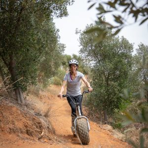 The tour takes place on the slopes of Farm Banhoek in the Banhoek valley and uses large non-motorised gravity scooters designed for stable off-road riding.